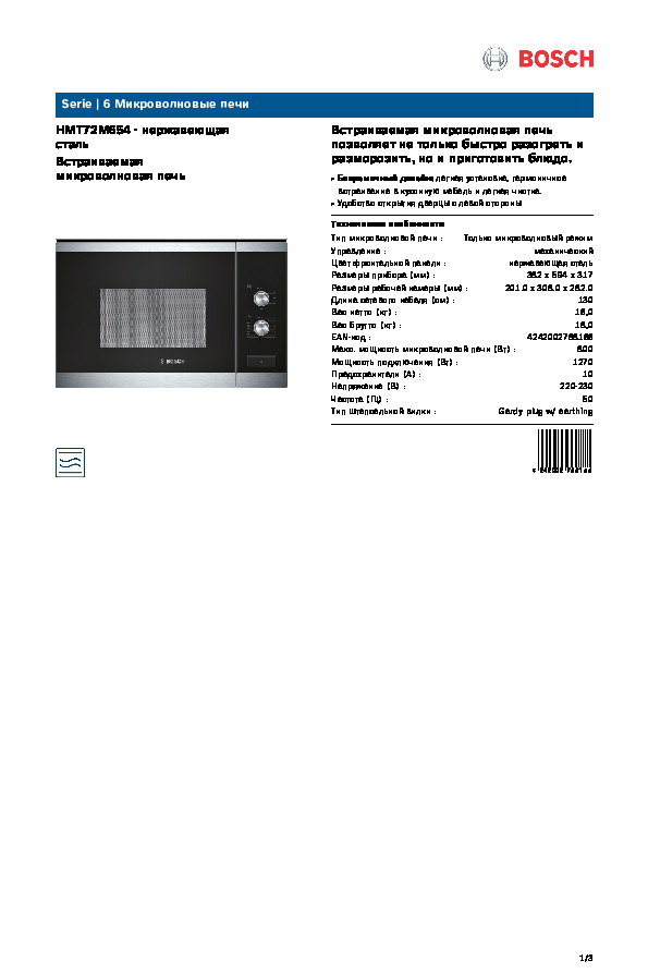 Микроволновые печи Bosch — это гармония инновационных технологий, эргономичного дизайна и интеллектуальных функций для быстрого и равномерного приготовления. Продуманные решения, такие как система 3D-распределения микроволн, автоматические программы и функция разморозки, обеспечивают высокую эффективность и удобство использования. Скачайте официальные инструкции и руководства, чтобы раскрыть полный функционал вашей микроволновой печи и пользоваться ей максимально комфортно и безопасно.