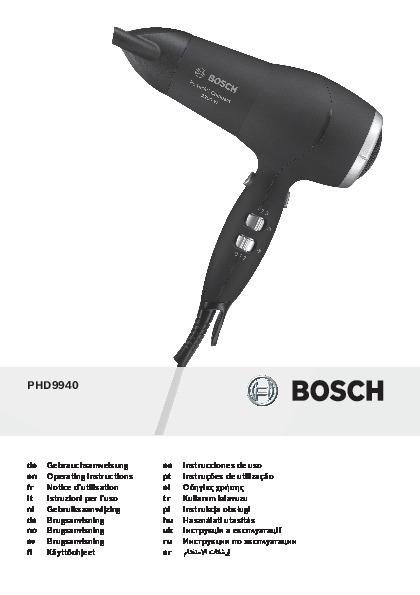 Инструкция по эксплуатации для фена и выпрямителя Bosch PHD 9940 — скачайте официальное руководство для Bosch PHD. Инструкция поможет быстро разобраться с работой фены и выпрямители и использовать его без ошибок.