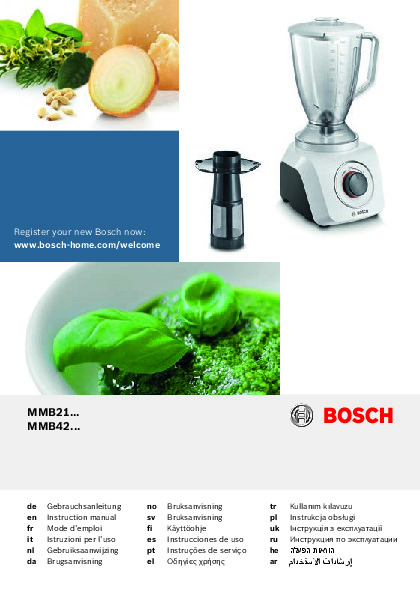 Инструкция по эксплуатации для блендера Bosch MMB 43G2B — скачайте официальное руководство для Bosch MMB. Инструкция поможет быстро разобраться с работой блендеры и использовать его без ошибок.