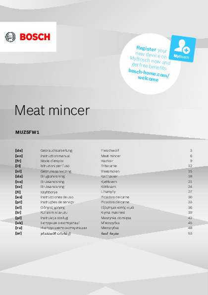 Инструкция по эксплуатации для комбайна Bosch MUM 54I00 — скачайте официальное руководство для Bosch MUM. Инструкция поможет быстро разобраться с работой комбайны и использовать его без ошибок.