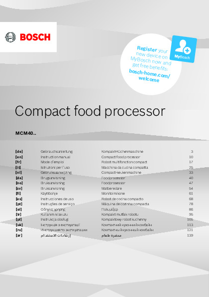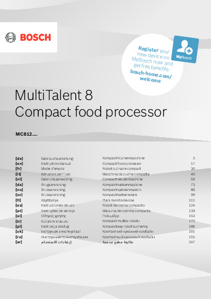 Bosch food processors combine power, ergonomic design, and smart technologies for professional results in your kitchen. Well-engineered features like the instant accessory change system, precision chopping, and overload protection ensure maximum efficiency and durability. Download official manuals and guides to unlock the full potential of your food processor and enjoy unparalleled convenience and reliability.