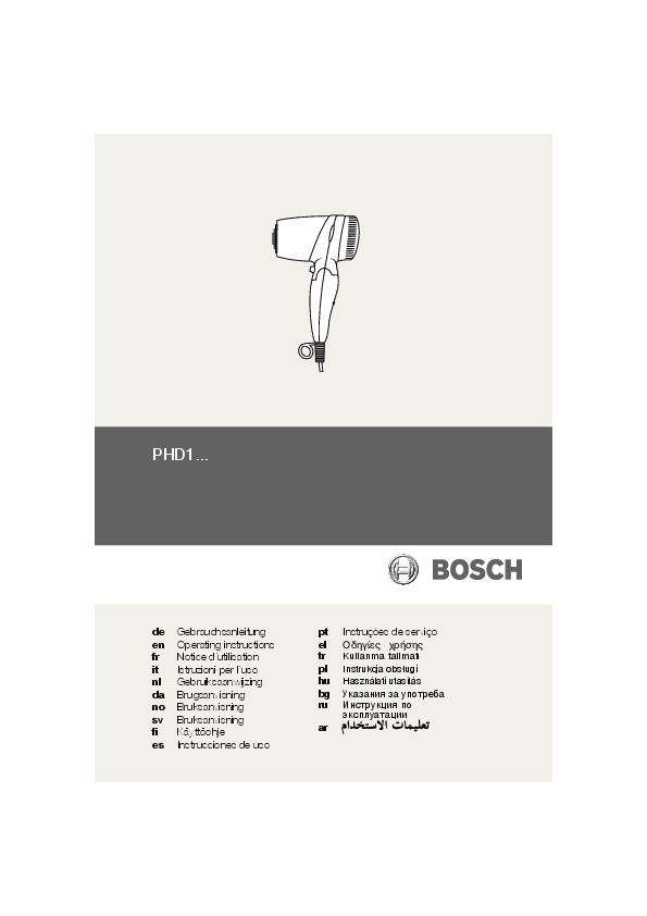 Инструкция по эксплуатации для фена и выпрямителя Bosch PHD 1151 — скачайте официальное руководство для Bosch PHD. Инструкция поможет быстро разобраться с работой фены и выпрямители и использовать его без ошибок.