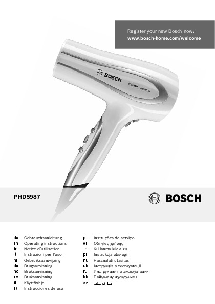 Инструкция по эксплуатации для фена и выпрямителя Bosch PHD 5987 — скачайте официальное руководство для Bosch PHD. Инструкция поможет быстро разобраться с работой фены и выпрямители и использовать его без ошибок.