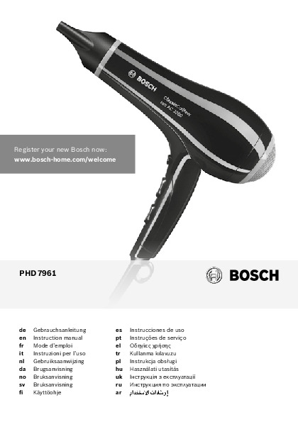 Инструкция по эксплуатации для фена и выпрямителя Bosch PHD 7961 — скачайте официальное руководство для Bosch PHD. Инструкция поможет быстро разобраться с работой фены и выпрямители и использовать его без ошибок.