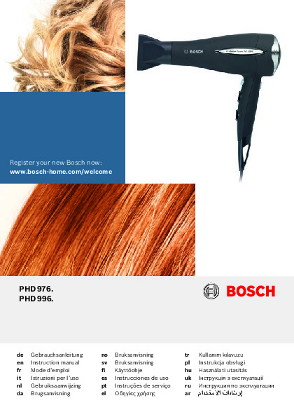 Инструкция по эксплуатации для фена и выпрямителя Bosch PHA9760 — скачайте официальное руководство для Bosch PHA9760. Инструкция поможет быстро разобраться с работой фены и выпрямители и использовать его без ошибок.
